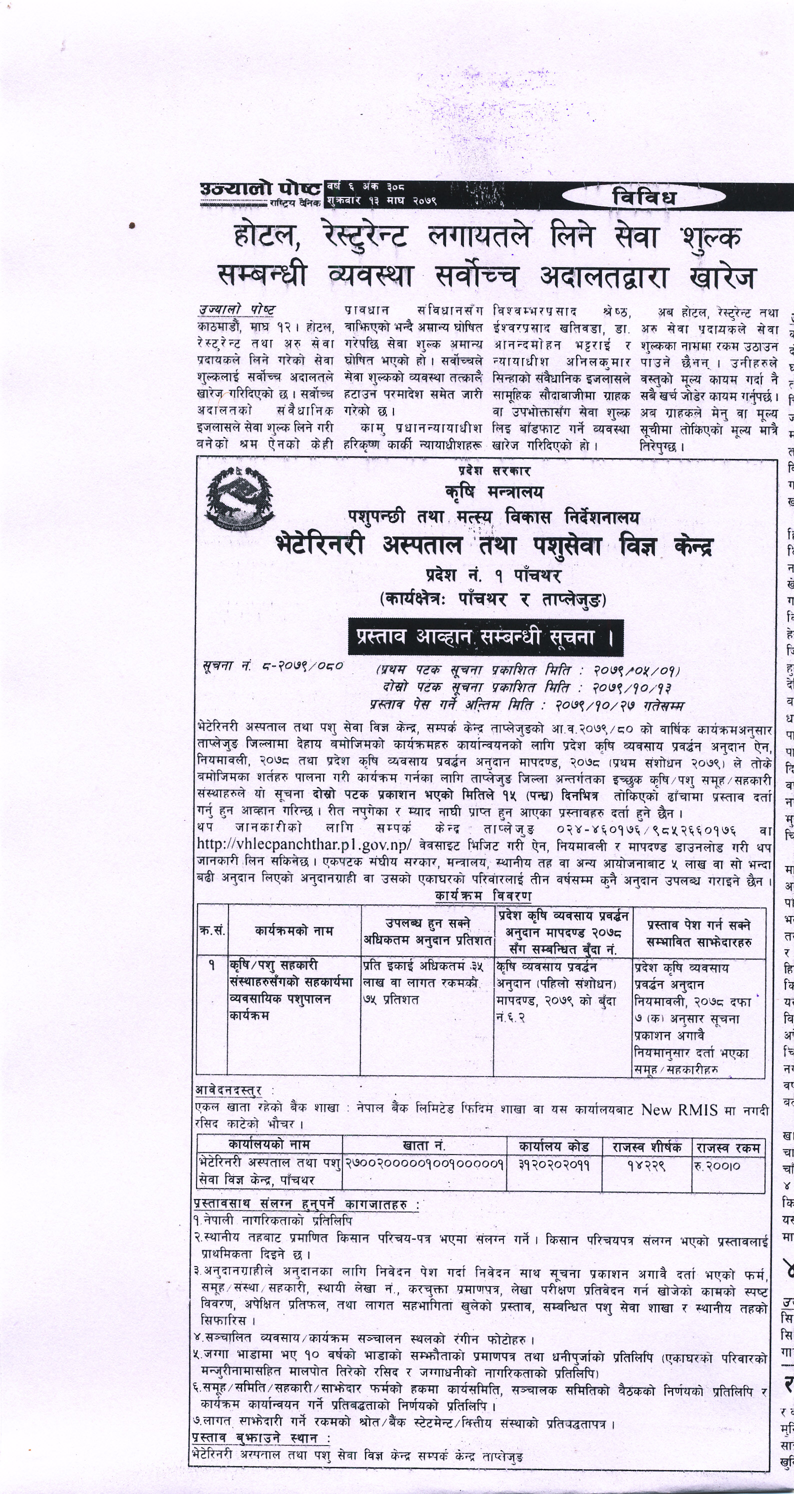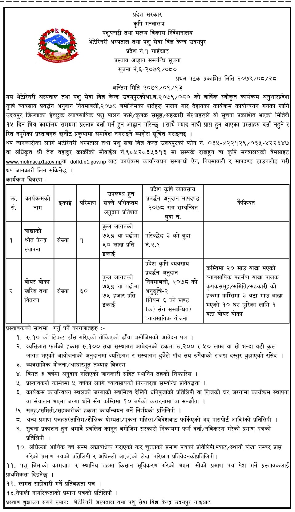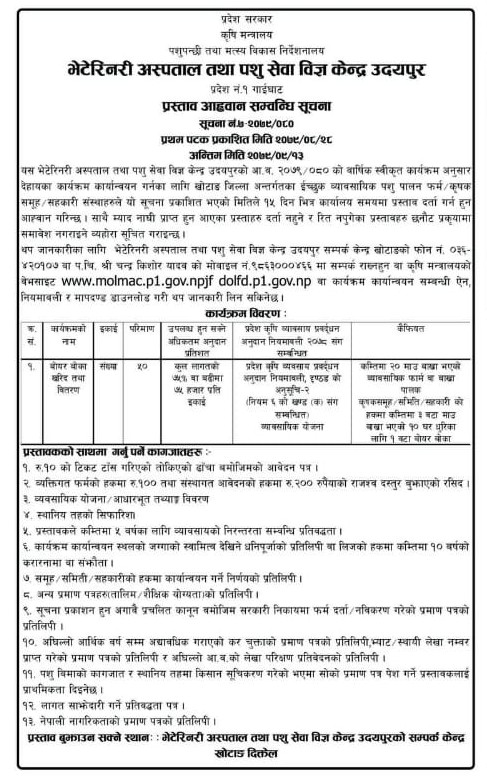 भेटेरिनरी अस्पताल तथा पशु सेवा सम्पर्क केन्द्र, खोटाङ्को आ व २०७९/८० विषेश अनुदान तर्फ कार्यक्रमको सूचना आवहान