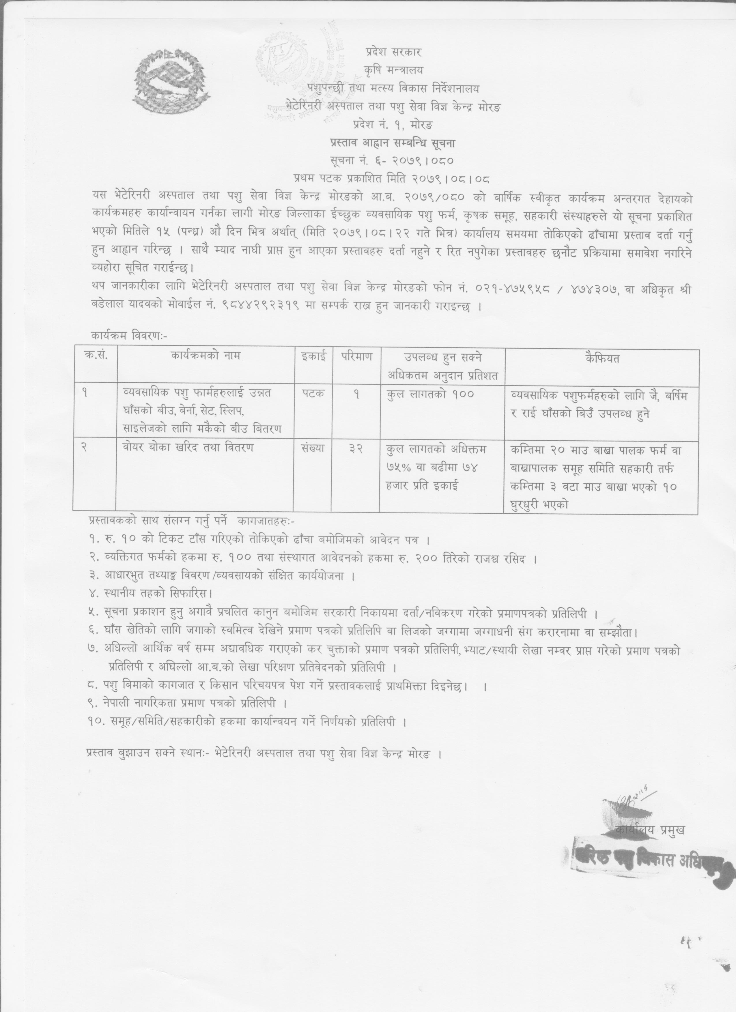 भेटेरिनरि अस्पताल तथा पशु सेवा विज्ञ केन्द्र मोरङको आ व २०७९/८० को विषेश अनुदान तथा प्रदेश सरकार तर्फको अनुदान कार्यक्रमको सुचना आवहान