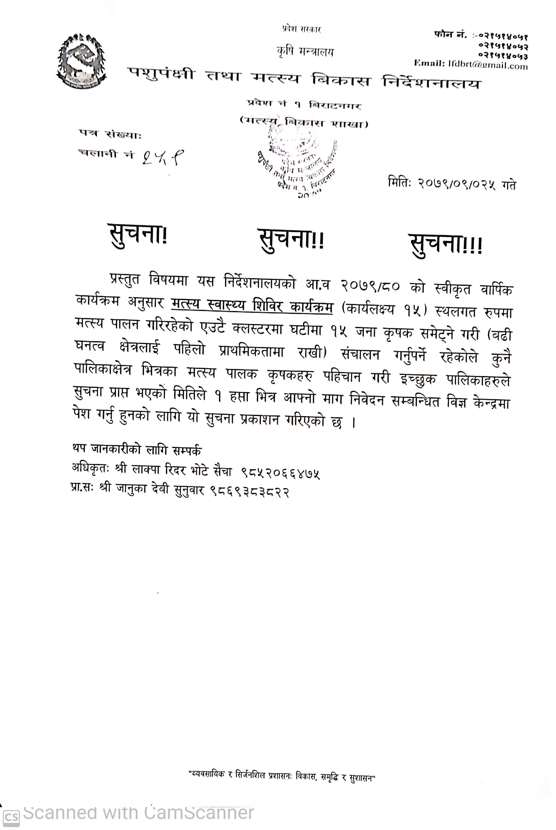 पशुपन्छी तथा मत्स्य विकास निर्देशनालय, विराटनगर आ व २०७९/80 शुद्ध नश्ल उन्नत माउमाछा माग गर्ने बारे सुचना आवहान.