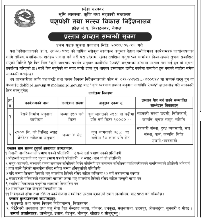 पशुपन्छी तथा मत्स्य विकास निर्देशनालय, प्रदेश नं. १, विराटनगरको आ.व. २०७७/७८ को प्रस्ताव आह्वान सम्वन्धी सुचना 2077-06-01