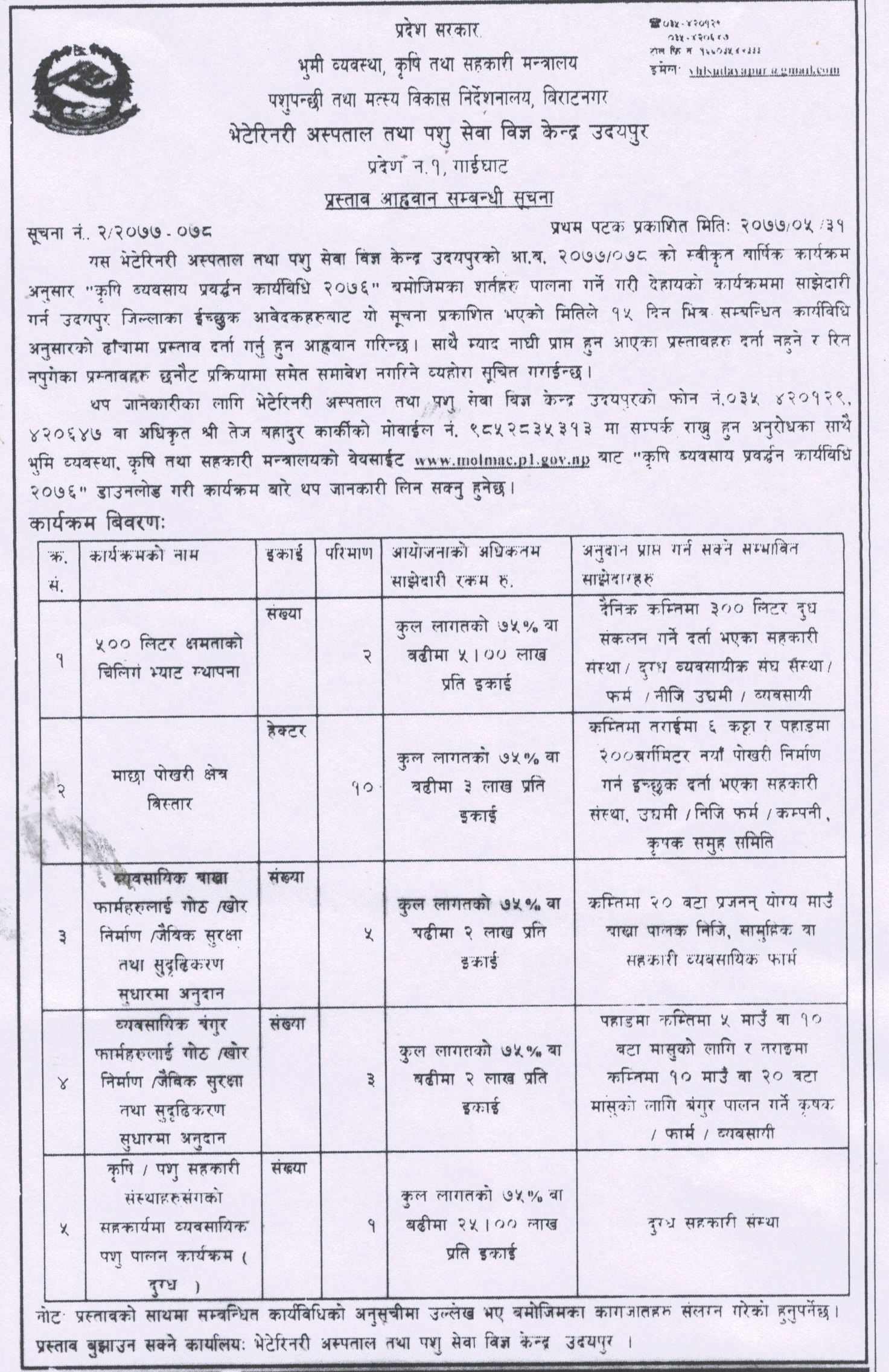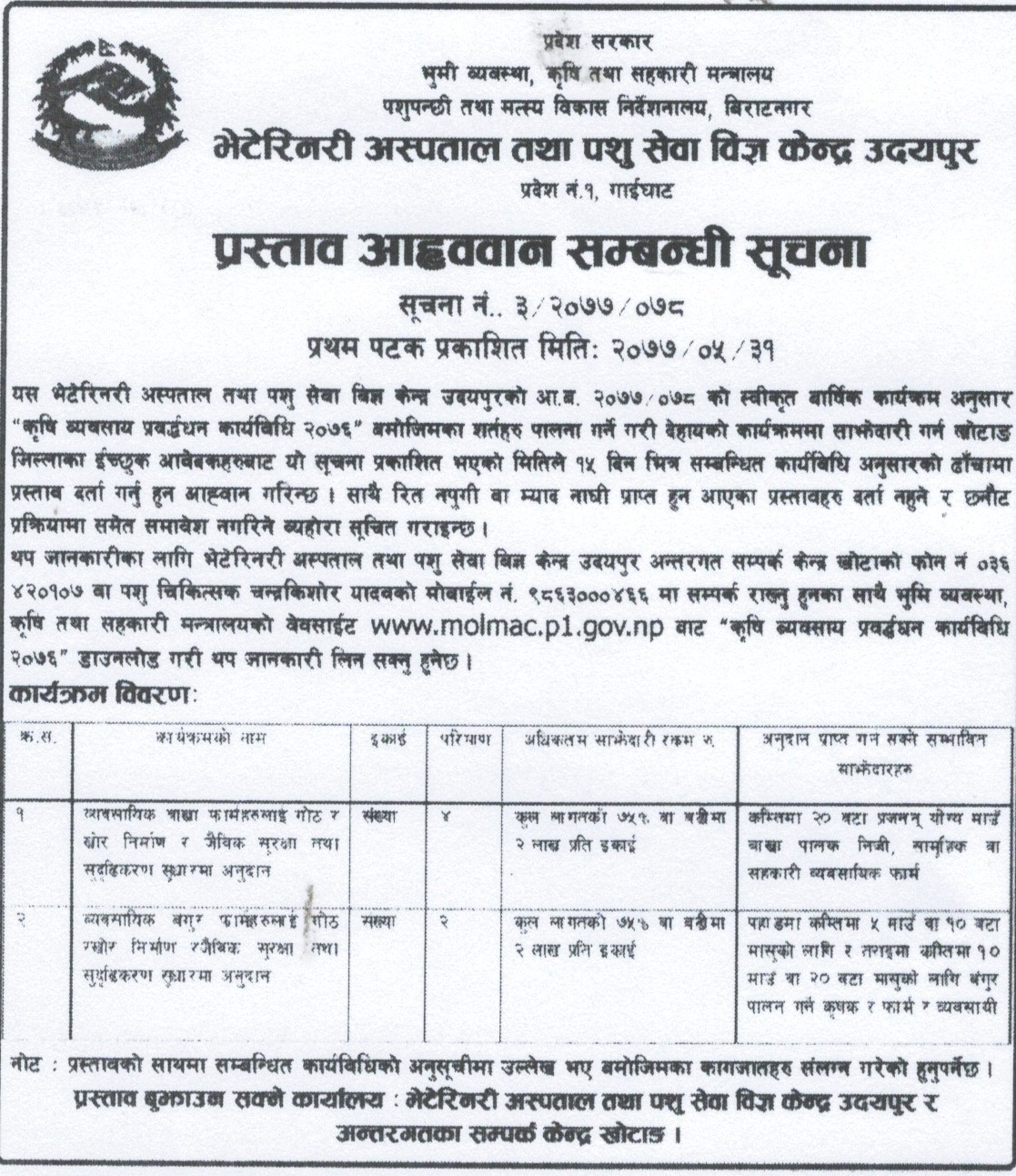 भेटेरिनरी अस्पताल तथा पशु सेवा विज्ञ केन्द्र, उदयपुरको आ.व. २०७७/७८ को प्रस्ताव आह्वान सम्वन्धी सुचना 2077-05-31