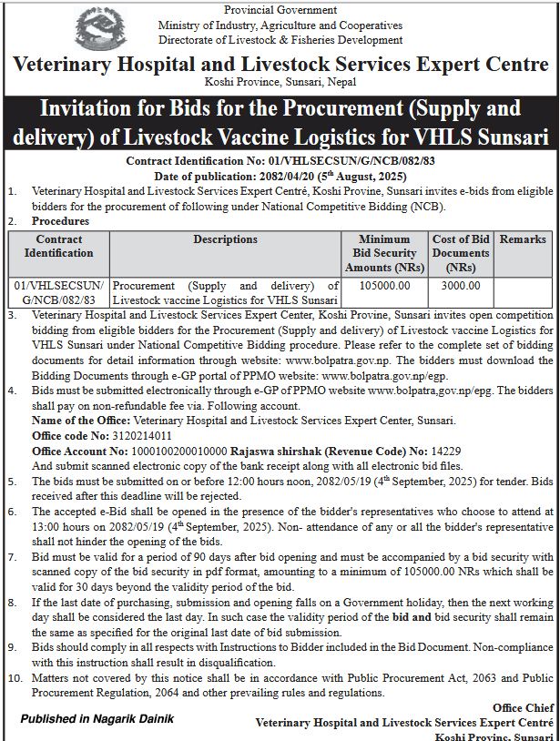 खोप कार्यक्रम सन्चालनका लागी आवश्यक सामाग्री आपुर्ती सम्वन्धी भेटेरिनरी अस्पताल तथा पशु सेवा विज्ञ केन्द्र, सुनसरीको सुचना
