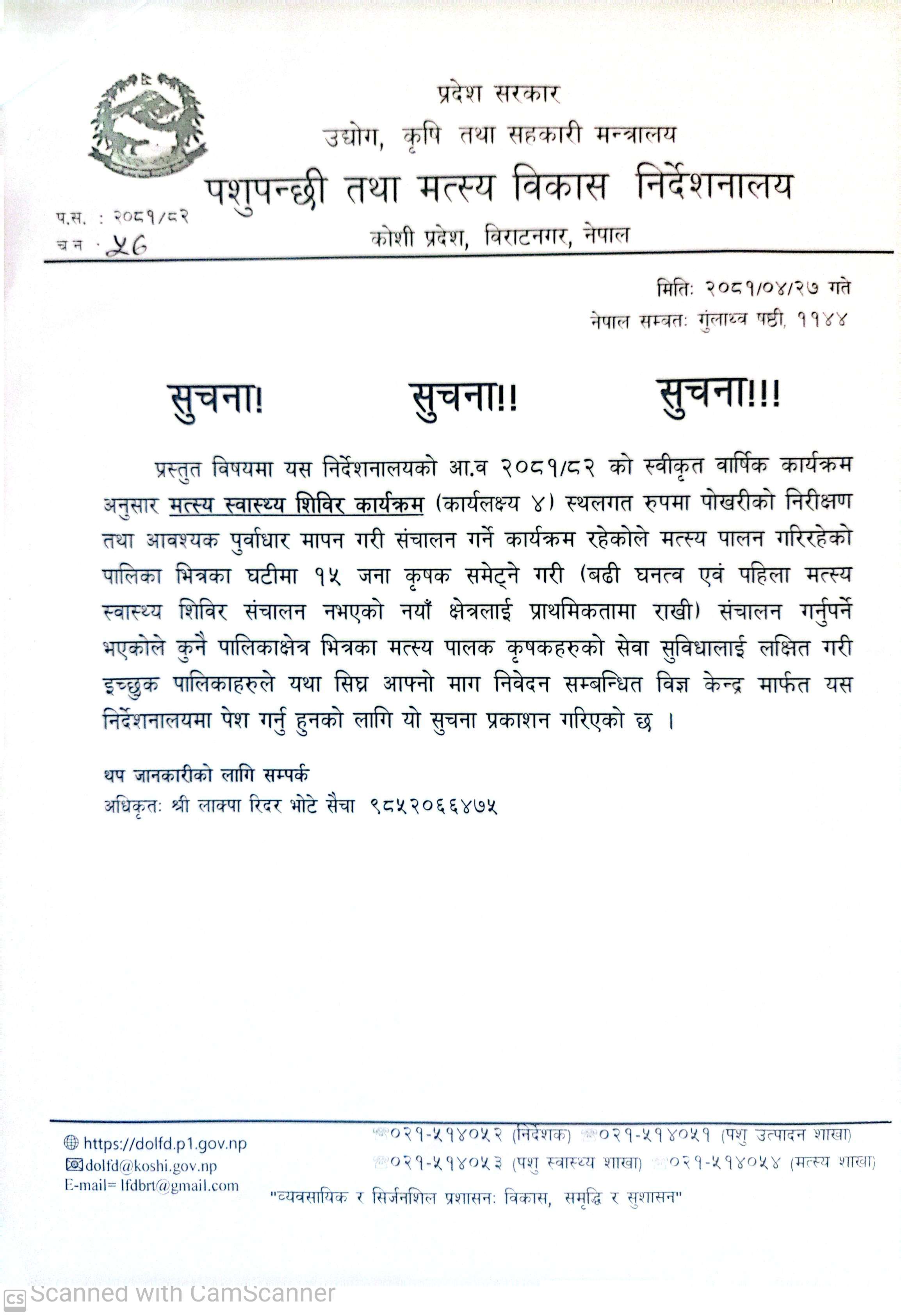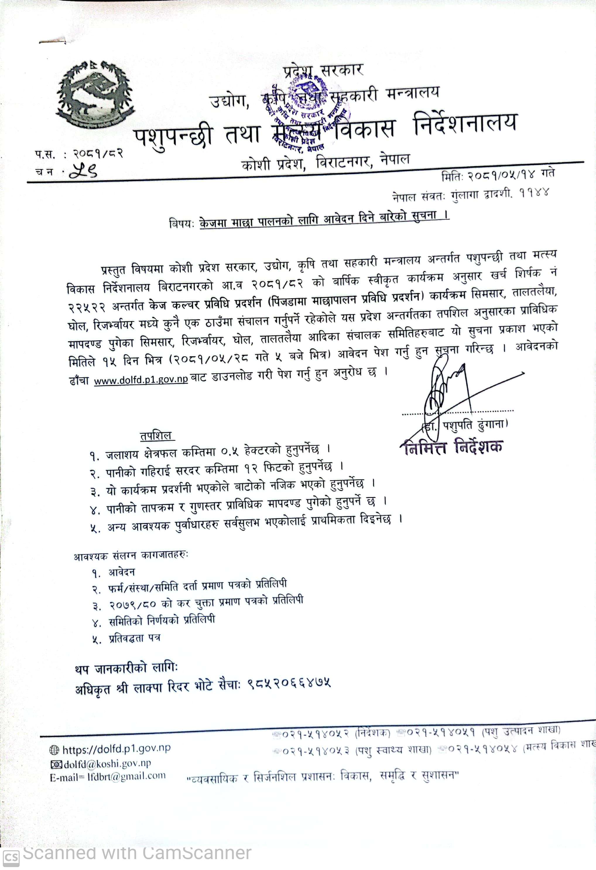 केजमा माछा पालनका लागी आवेदन आवेदन दिने बारेको सुचना । 2081-05-14