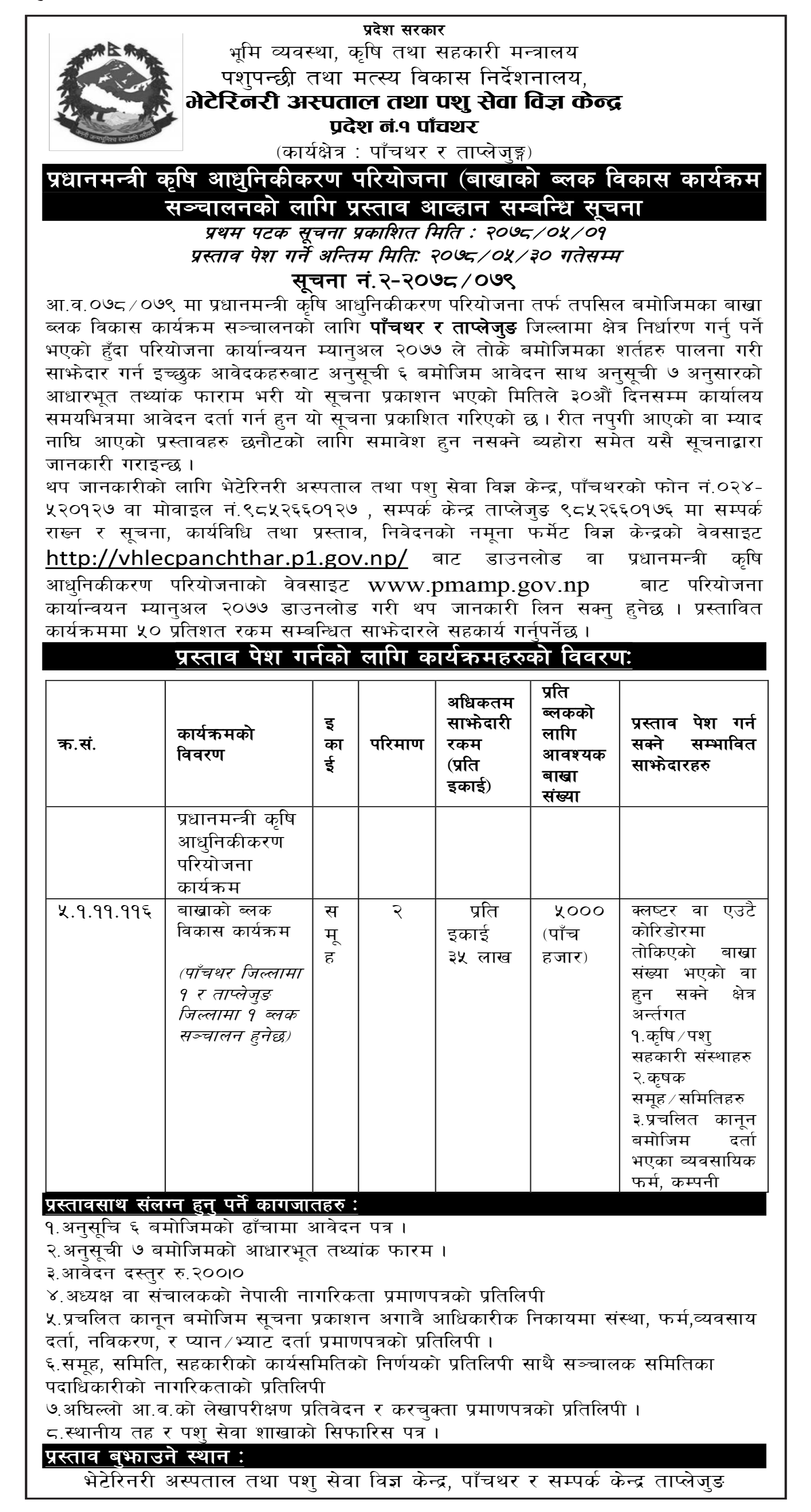 आ.व २०७८/७९ को भेटरीनरी अस्पताल तथा पशु सेवा विज्ञ केन्द्र पाँचथरको PMAMP तर्फ कार्यक्रमको प्रस्ताव आवहान 2078-05-01