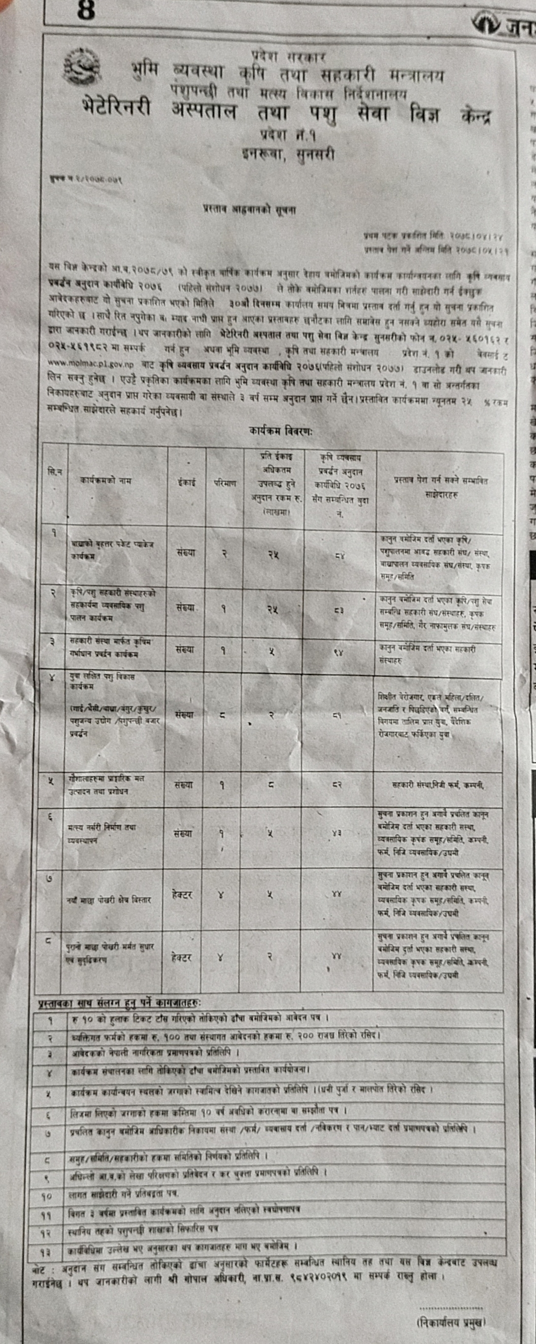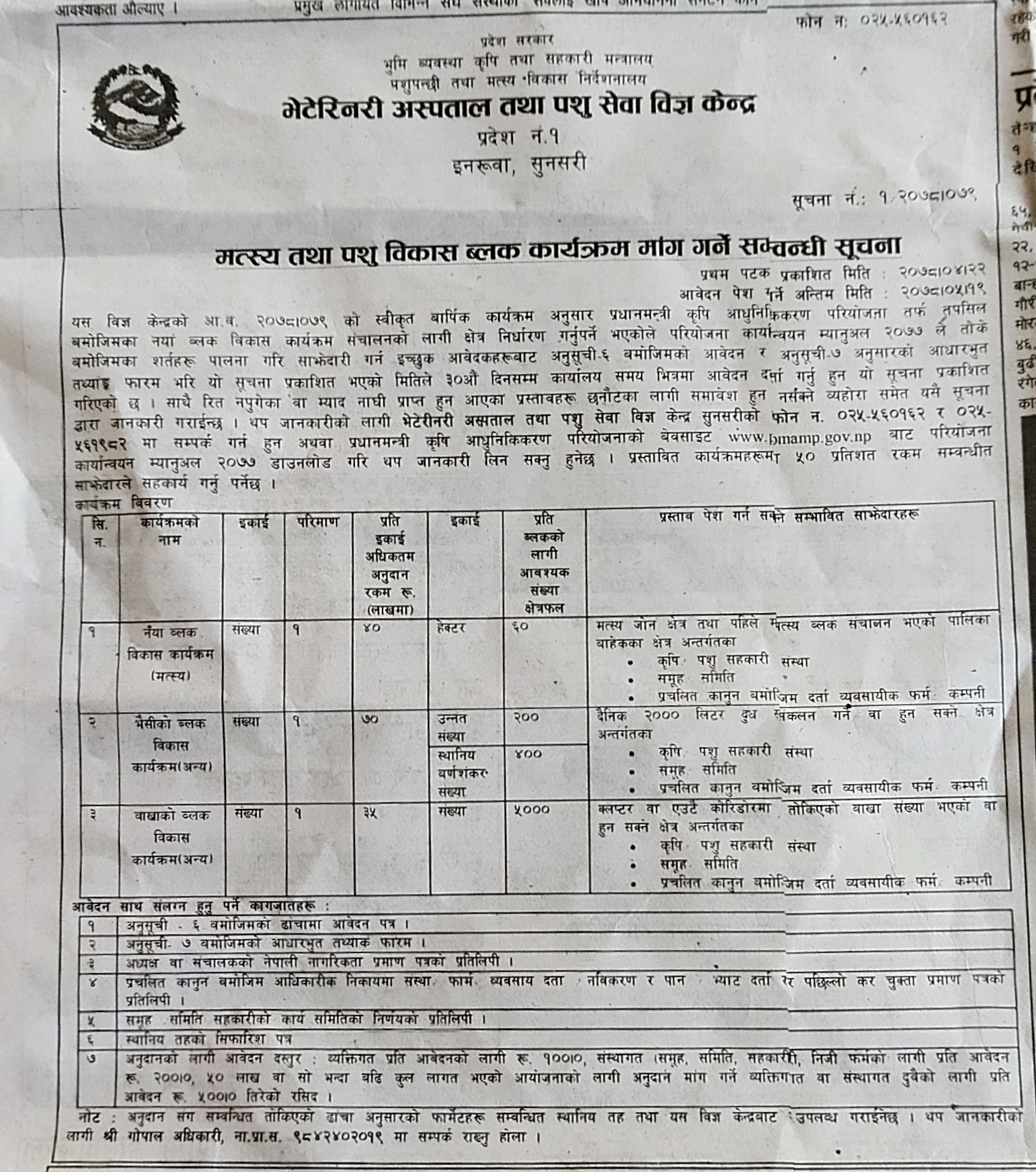 आ.व २०७८/७९को भेटेरिनरी अस्पताल तथा पशु सेवा विज्ञ केन्द्र सुनसरीको सुचना आवहान 2078-04-24