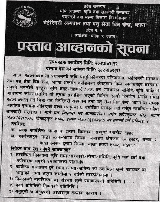 भेटेरिनरी अस्पताल तथा पशु सेवा विज्ञ केन्द्र, धनकुटाको आ.व.२०७७/७८ को प्रस्ताव आह्वान सम्वन्धी सुचना