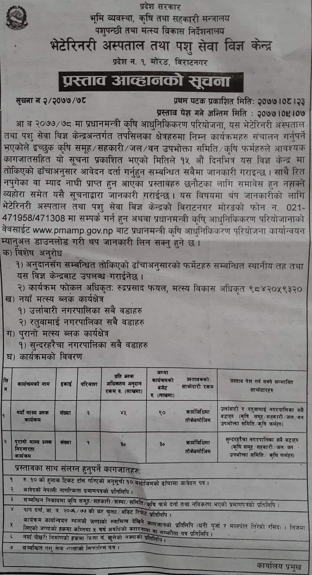 भेटेरिनरी अस्पताल तथा पशु सेवा विज्ञ केन्द्र, मोरगंको आ. व २०७७/७८को स्वीकृत बार्षिक कार्यक्रम अनुसार प्रधानमन्त्री कृषि आधुनिकिकरण परियोजना अन्तरगतको #नँया मत्स्य ब्लक कार्यक्रम र पुरानो मत्स्य ब्लक निरन्तरता कार्यक्रम सुचना आह्वान