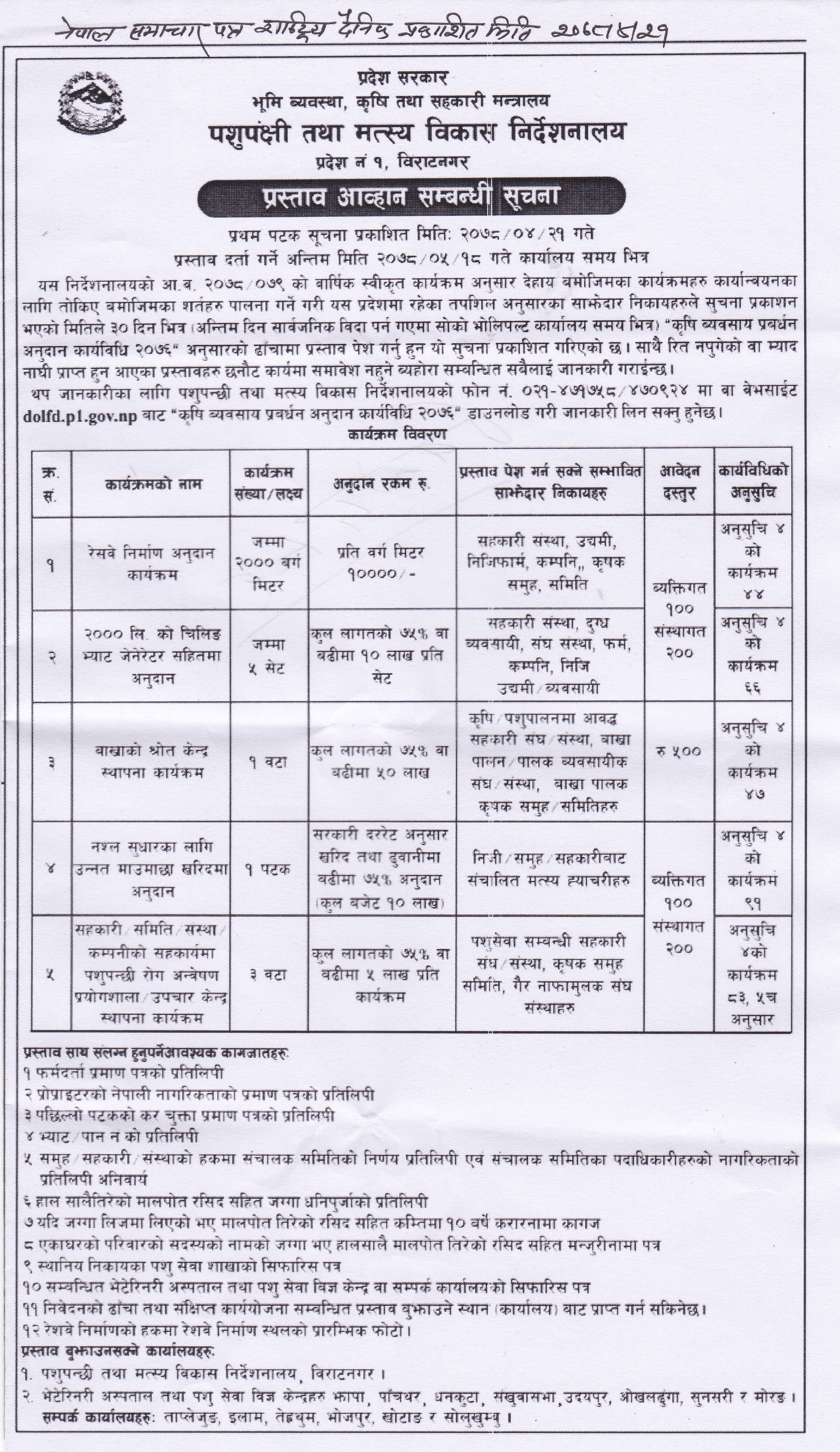 आ.व २०७८/७९ पशुपन्छी तथा मत्स्य विकास निर्देशनालय प्रदेश नं १ अनुदान कार्यक्रमको सुचना आवहान